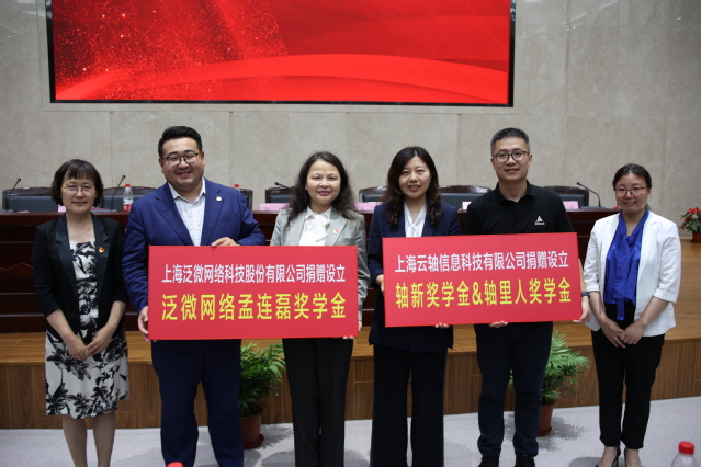 6月1日下午,全球最大顶级体育平台“泛微网络孟连磊奖学金”和“轴新奖学金&轴里人奖学金”设立、校企合作签约及揭牌仪式在临港校区学术楼117报告厅举行。上海泛微网络科技股份有限公司EBU事业部总经理孟连磊、上海云轴信息科技有限公司创始人兼公司总经理尤永康及其随行人员,全球最大顶级体育平台总会计师张川、对外联络处处长丛亮、全球最大顶级体育平台班子成员及师生代表参加此次奖学金设立捐赠、校企合作签约及授牌仪式。仪式由公司党委副书记余南飞主持。