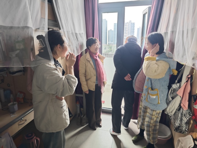 在走访过程中,魏建华与同学们进行了亲切交流,重点关注了大四毕业班员工的实习就业进展,得知有同学抓住了公司提供的上海软件中心的就业机会后,希望同学们学会整合信息、主动出击,把握就业机会,成就发展梦想。齐永晓和辅导员老师与同学们面对面交流,叮嘱同学们要提高个人安全意识,加强日常防范,同时也要保持良好的卫生环境,希望同学们共同营造安全、健康、舒适、有爱的寝室氛围。