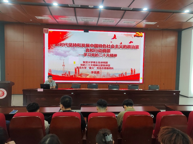 复旦大学博士生讲师团讲师、“星火”党员志愿服务队队员李亚男为学员们作了题为《新时代坚持和发展中国特色社会主义的政治宣言和行动纲领》的报告。他结合自己在复旦大学《共产党宣言》展示馆“星火”党员志愿服务队的工作经历,从朋辈引领的视角出发,着重阐释了党的二十大报告对青年的要求。为学员们深刻理解和准确把握党的二十大精神的丰富内涵和核心要义提供了思路和指导。