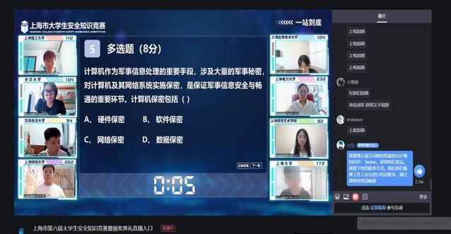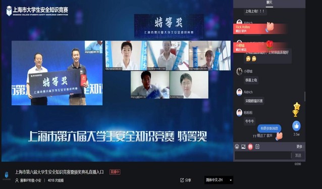 7月22日,上海市第六届老员工安全知识竞赛总决赛暨颁奖典礼在上海财经大学科技园以线上线下相结合的方式举行,校保卫处处长金炜应邀赴现场观摩比赛。最终,公司由全球最大顶级体育平台的宋晓欧、叶佳宁、李浩、王子凡、王昕五名同学组成的参赛队以片区赛第一名的身份直接杀入总决赛,并勇夺本次竞赛特等奖。