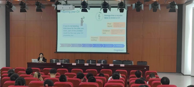 为了提高员工的求职能力,公司还安排了求职技巧培训。高知特信息技术(上海)有限公司的HR朱梦希,分别从企业人力资源和职场技能培训角度,讲解了毕业生简历的制作、面试应聘技巧以及求职技能准备等。