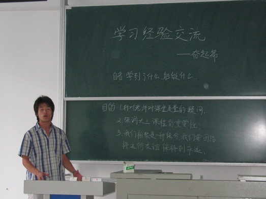 6月1日,08级通信工程专业在南2201开展了“学习经验交流――奋起篇”的活动。辅导员陈雯老师出席了本次经验交流会。此次活动的主要目的一是交流大家上课的学习状态;二是提出大三课程的重要性;三是促进两个班级的交流,加强友谊。