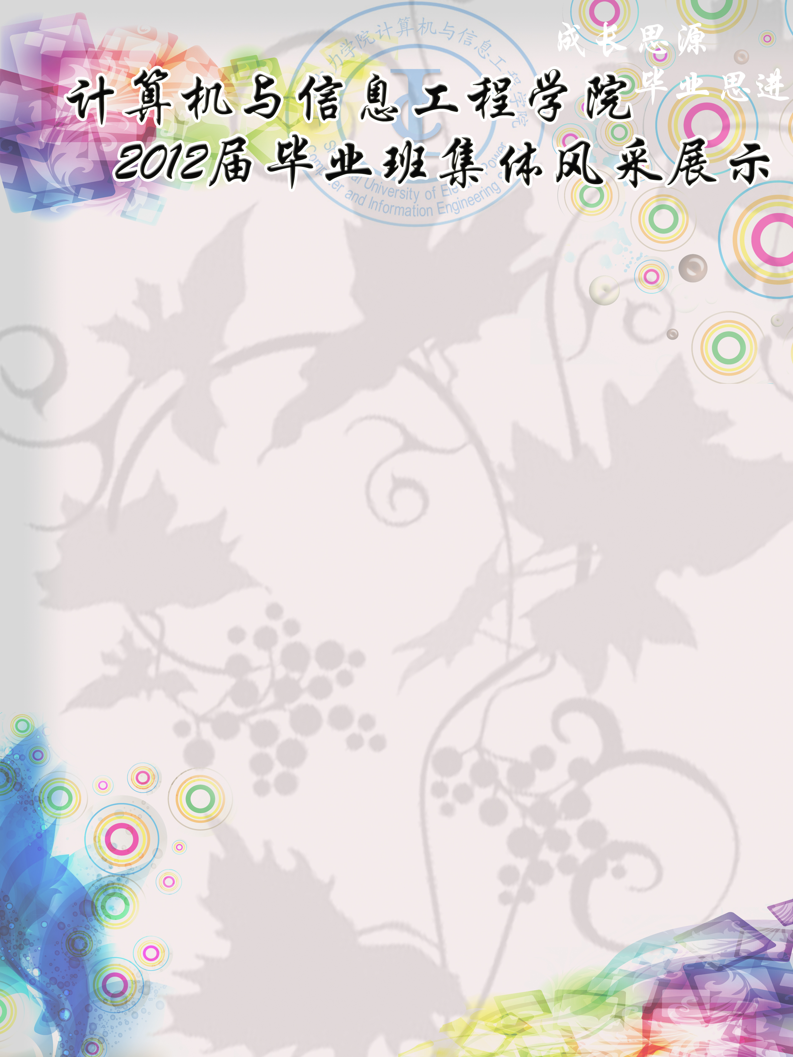 2008年的秋天,你们背着重重的行囊踏入计信的大门,开始了老员工活,在这里为自己的美好未来奋斗着。转眼到了2012年的夏天,你们即将挥别母校,怀着远大的理想,奔往人生的下一站。可敬的老师、温暖的班集体还有亲爱的同学,这些曾经熟悉的一切终将成为回忆。回首四年光阴,没有谁会轻易地说那不算什么,没有谁会从容地将它遗忘,回忆,珍藏,或许就是你们现在能做的最好的事情。我们能做的事情很多,但是有限的时间不允许我们过多地停留,所以,请翻开你们的记忆,努力寻找曾经留在母校的真切体验,努力回想过往的点点滴滴,将她留在电院,留在计信那永远的08级!