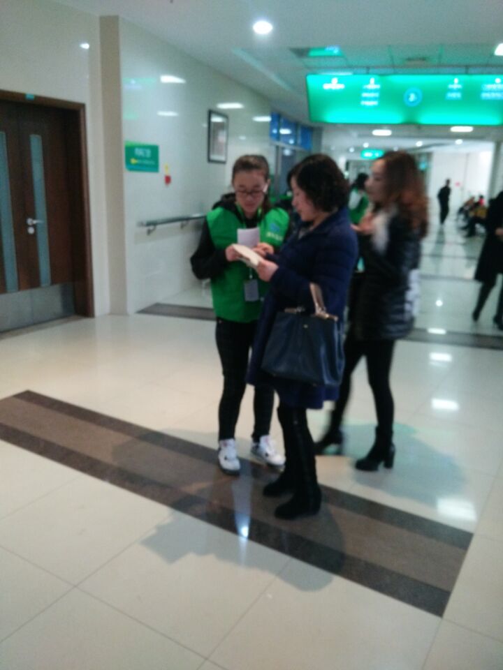 同学们都竭尽所能的做好自己的工作。陪小朋友的有四个人,两两为一组到不同的病房陪小朋友玩耍,到病房里,在经过家长同意后,拿出了七巧板和魔方陪小朋友们一起拼凑,病房里顿时充满了欢声笑语;控烟的同学在医院走廊上不时的巡查着,若有发现吸烟者,便会上前礼貌地制止,告知其吸烟的危害性,并指出了规定的吸烟区,也对他们的配合道声谢谢,而且多数人是知晓医院不吸烟的规定的,他们都很自然地遵守着这一规定;疏导道路的同学在外面的寒风中也一丝不苟的完成着使命,寒冷的天气也不能让他们退却,看见有闯红灯的行人,他们上前阻止,保证了交通的顺畅也让行人的生命有了保障;对前来询问的病人及其家属,志愿者必定是有问必答,帮助他们解决问题;负责问卷的同学也积极的完成着医院服务质量调研任务。