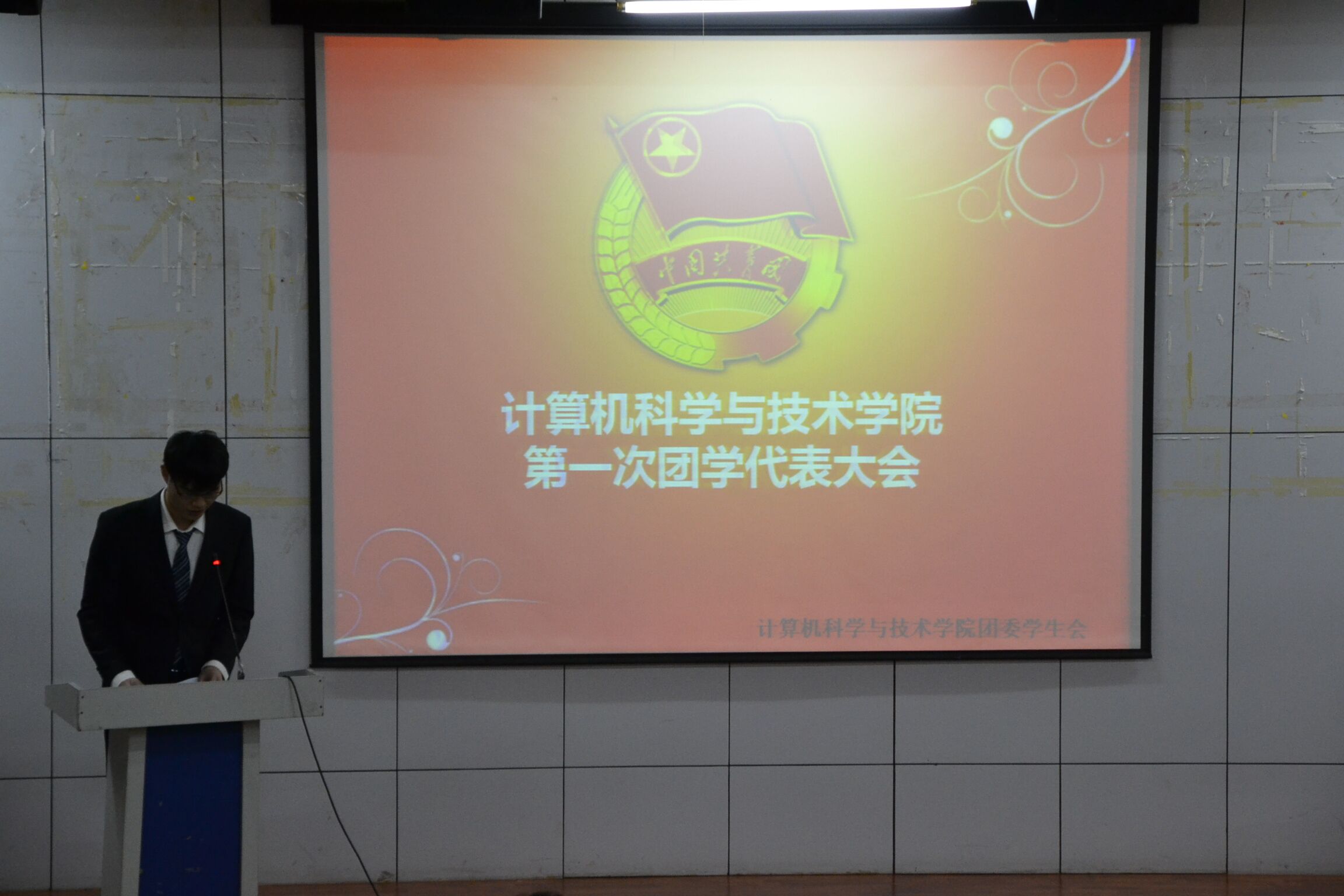 大会在激昂向上的共青团团歌中拉开序幕。首先,公司党委书记张仙智老师上台致词,她指出公司团学将贯彻党的十八大、十八届三中、四中全会精神,充分发挥共青团优势,组织带领全院青年践行社会主义核心价值观并扎实推进团学工作。紧接着,校团委郭克楠老师发表讲话,肯定了在校团委的领导和公司党委的带领下,公司团委在人才培养、科创研究、团队建设等多个方面取得的可喜可贺的成就。随后,大会筹备委员会副主任杜志豪同学做大会筹备工作报告,详细介绍了本次大会的主要议题、大会代表分配名额和原则和委员候选人产生情况等筹备工作。大会筹备委员会提案组代表白凯文同学做大会提案报告,提案涉及到公司配套设施建设、寝室文化建设、公司自身建设、公司团委员工会建设和校园安全建设五个方面。大会筹备委员会主任、院团委书记赵铮老师上台做大会工作报告,他从思政育人工作、团学管理制度的完善、以科技创新为特色的校园文化活动和志愿者活动工作四个方面回顾过去的一年公司团学工作,并提出未来争取使团学通过内部建设的加强成为具有影响力且能够推进校园文化建设的学习型、服务型团组织。