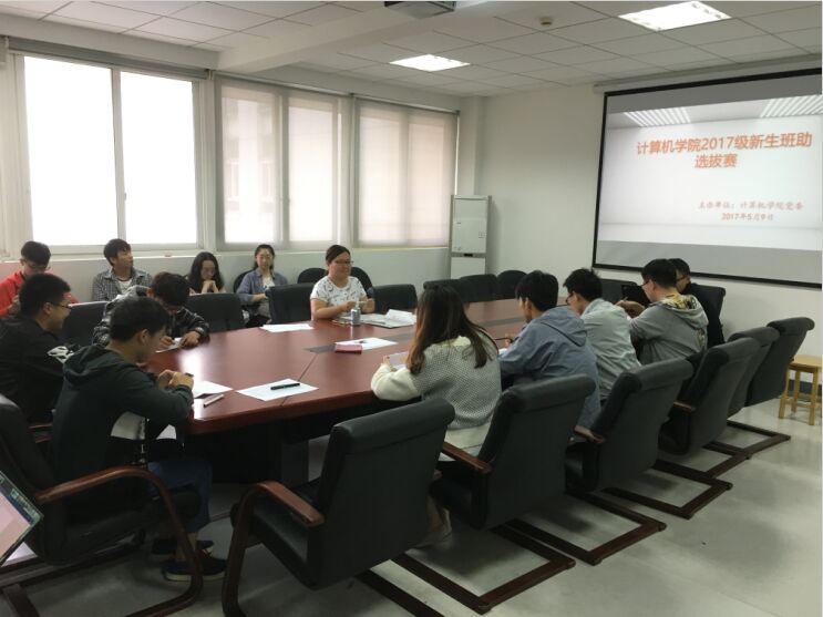5月9日晚,公司2017级新生班助的选拔工作在公司会议室举行。公司负责思政的吴涵老师、辅导员朱佳老师、院员工会主席刘圣地以及2016级的所有班助担任评委,2015级信安、软件、计算机专业共14名同学参加选拔。