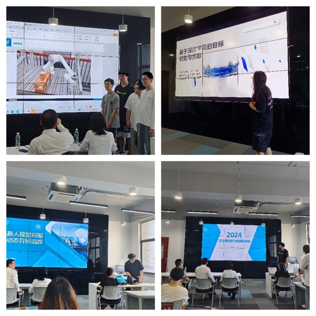 在每个团队的展示环节之后,教师组与员工们进行了深入的互动交流。张传林、徐曼、范自柱、栗风永等老师对每个项目进行了详细的点评,对课题的原理、实现细节、应用价值等方面进行了深入探讨,指出了课题完善的方向。他们从行业发展、学术动向、实际需求和技术应用前景等多个角度提出了问题,例如:机械臂的避障能力和应用场景,如何处理不规则物体的抓取,多目标识别的实现方式,自动驾驶模型在高速行驶时的不同表现,项目的识别率和精度问题,梯度下降的优化程度等。这些问题激发了员工们对课题相关技术发展方向及其可能遇到的问题的深入思考。